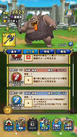 ドルマ属性の「ダークスパイク」、バギ属性の「ふうじん鉄甲斬」と2種類の属性攻撃保持は中々優秀。