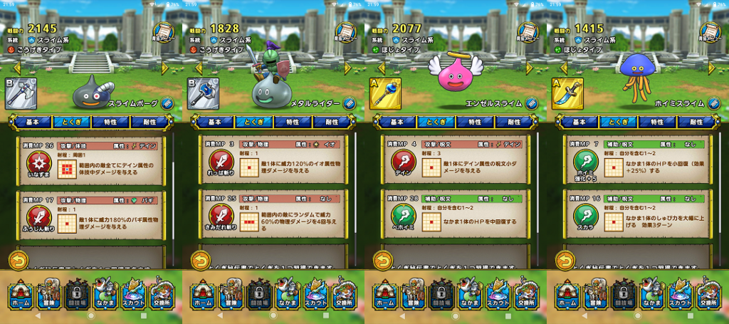 スライムボーグの「いなずま」とメタルライダーの「さみだれ斬り」をメイン火力として、エンゼルスライム、ホイミスライムの2体で回復しつつ戦いました。